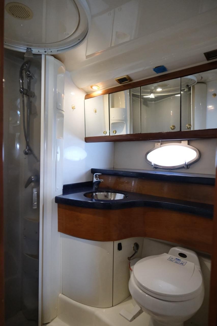 Master cabin forward with double bed and en-suite bathroom with shower Port side cabin amidships with a double bed Starboard side cabin amidships with twin single lower beds 2nd bathroom with shower shared by the two guests cabins